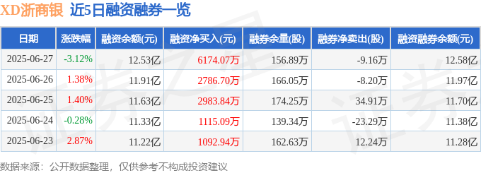 XD浙商银融资融券信息显示,融资方面,当日融资买入2.15亿元,融资偿还1.53亿元,融资净买入6174.07万元,连续3日净买入累计1.19亿元。融券方面,融券卖出5.22万股,融券偿还14.38万股,融券余量156.89万股,融券余额534.99万元。融资融券余额12.58亿元。