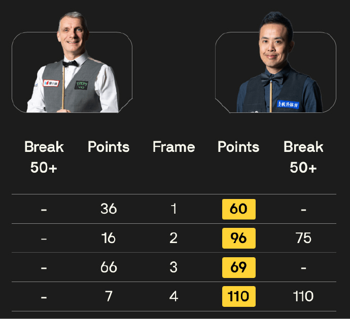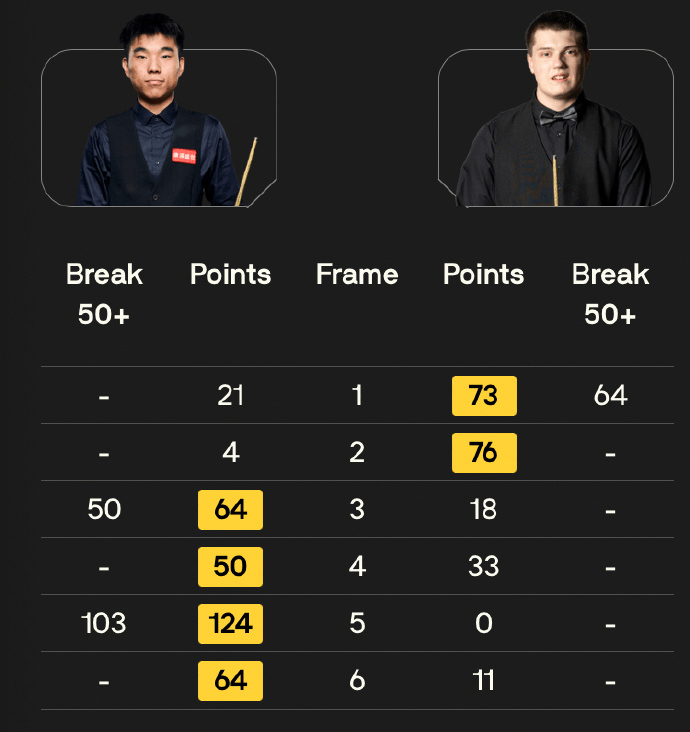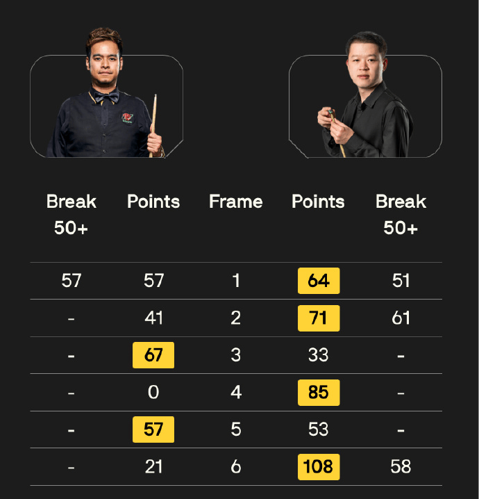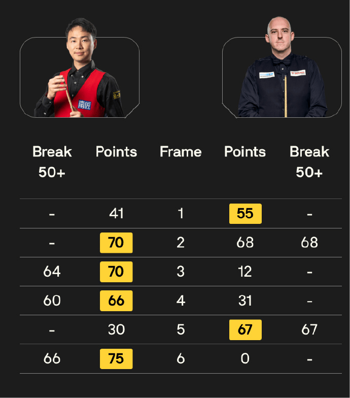 其他部分场次比赛中,范争一打出一杆破百(103)和一杆50分,以4-2击败朱利安-勒克莱尔;龙泽煌2-4不敌阿米尔-萨克霍什;徐思打出三杆50+,以4-2战胜大卫-格雷斯。