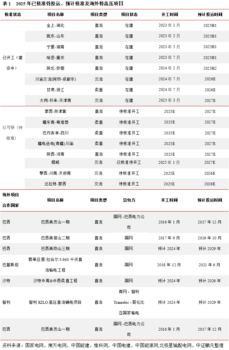 2025年特高压招标推进节奏较2024年提速,全年预计投产“两交五直”,“十六交十二直”储备充足。2024年末,特高压招标推进节奏略慢,但2025年Q1电网建设节奏明显提速。2025年1-4月,电网投资同比增加25%广盛网,近期陇东-山东特高压已投运。2025年1月,大同-天津南交流特高压设备公布中标结果,涉及新建3个变电站及扩建1个变电站,招标规模庞大,达到50亿元。同时,甘肃-浙江全球首条送受端双柔直的核心设备首次招标落地,具有重要示范意义。2024年Q4,国网公布特高压第五批设备的中标结果,主要针对甘肃浙江线路核心设备进行招标(除换流变等),招标金额超过80亿元,其中柔性直流换流阀价值量达43.5亿元,显著高于常规直流线路,显示出较大的增量弹性。2025年Q1,完成了该线路的换流变、穿墙套管等核心设备招标,金额超过30亿元。此外,烟威、海阳辛安核电送出两项特高压工程已于2025年元旦前后核准落地。2025年第一批特高压设备招标需求主要来自烟威工程和平圩电厂,招标总额约 20亿元。2025年预计将投产“两交五直”,未来几年或将开工“十六交十二直”,特高压线路储备充足。根据中国能源报,2025年将投产特高压线路“两交五直”,未来几年,列入计划可能开工特高压“十六交十二直”,“十五五”景气度持续。