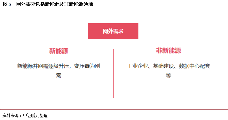 网外需求包括新能源及非新能源领域。新能源方面,并网需逐级升压,变压器为刚需。2025年1-5月风电装机增长迅猛,前5个月国内新增风电装机46.28GW,同比增长134%,5月单月新增风电装机26.32GW,同比增长801%,截至5月底全国风电装机容量约5.7亿千瓦,同比增长23.1%。此外,光伏装机规模庞大,2025年预计全国新增装机250GW,同比增加4%左右。新能源配套需求虽总体增速放缓,但规模仍较高,存在结构化增量机会,尤其是风电,特别是海上风电配套环节。非新能源方面,涵盖工业企业、基础建设、数据中心配套等。工业企业端需求相对企稳,2025年1-4月全社会用电量同比增长2.5%,制造业固定资产投资增长8.8%,对2025年固定资产投资持谨慎乐观态度,预计工业企业端需求保持稳定。整体来看,网外需求规模庞大,为变压器等设备提供了广阔的市场空间。