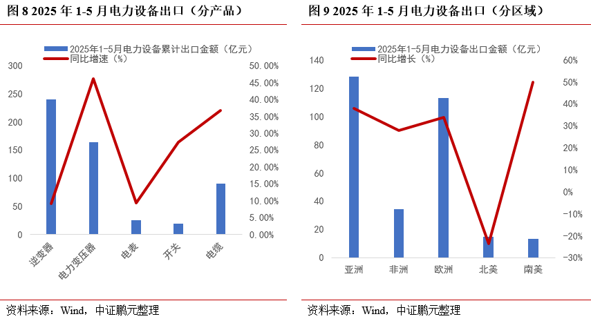 中国电力设备出海表现强劲,面临挑战与机遇。从数据来看,2025年1-5月电力设备出口数据强劲。其中,逆变器、电力变压器、电表、开关、电缆分别出口240.04亿元、164.64亿元、24.97亿元、19.60亿元、90.50亿元,同比分别增长9.25%、46.22%、9.33%、27.26%、36.75%。其中,电力变压器和开关增速较快。按出口地区划分,亚洲出口128亿元,同比增长38%;非洲出口34.5亿元,同比增长28%;欧洲出口113.2亿元,同比增长34%;北美出口15亿元,同比下降23.64%;南美出口13.1亿元,同比增长50%。亚洲市场整体表现稳健,尤其是电缆出口增长显著,主要受益于印度、巴基斯坦等国家的户储需求。欧洲市场需求稳定,德国市场表现优异,同比增长129.28%。北美市场受关税政策影响,出口金额同比有所回落,但环比已企稳。非洲市场部分国家如尼日利亚表现良好,但整体波动较大。