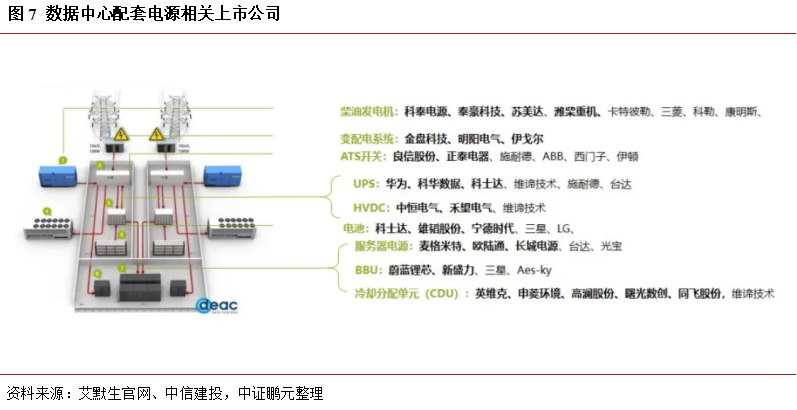 在网外市场,数据中心推动国产算力建设加速。随着数据中心向模块化发展,高压柴发渗透率提升,高端产品产能趋紧。受2025年中美关税影响,海外企业如康明斯、卡特比勒虽积极扩产,但新增产能多集中于海外基地,这加剧了国内柴发市场的短期供需错配,引发涨价预期。供应链格局改善及技术进步助力国内头部企业加速国产替代,建议关注潍柴重机(002236)。在配电系统领域,预制模组化与智能化成为发展主流。智算中心交付周期较短,预制化供配电模组以其占地小、交付快的优势,成为未来趋势。全球中低压变配电市场外资占优,但产能瓶颈使其交付周期延长。国内龙头企业凭借丰富产品矩阵和项目经验,有望扩大市场份额。配电系统预制化、集成化趋势明显,建议关注金盘科技(688611)、伊戈尔(002922)、明阳电气(301361)、盛弘股份(300693)、良信股份(002729)。在电源系统领域,功率提升是核心驱动力。机柜外电源方面,2024-2028年国内AIDC铅酸电池市场CAGR预计达45%,头部企业产能扩张较慢,短期供需紧平衡,涨价在即。随着AIDC能量密度和用电量增加,高压、高效成为趋势,预计到2028年海外/国内HVDC渗透率将分别提升至60%和30%,对应CAGR分别达128%和100%。巴拿马电源和SST方案也将逐步落地。机柜内电源方面,单机柜功率密度提升推动服务器电源技术迭代,大陆电源企业凭借研发优势崭露头角。英伟达GB300将BBU、超级电容列为标配,创造新增量市场,国内电芯企业积极布局BBU领域,有望实现双轮驱动。建议关注禾望电气(603063)、科士达(002518)、科华数据(002335)、麦格米特(002851)、欧陆通(003026)、江海股份(002484)。