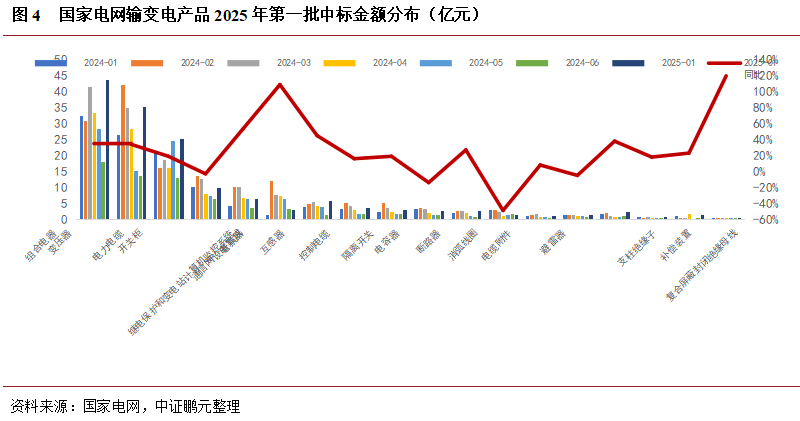 2025年国家电网在输配电工程领域持续高增速。第一批工程中标金额达到152.39亿元,同比增长24%。其中,组合电器、变压器、电力电缆分别中标43.94亿元、35.49亿元、25.24亿元,同比增长35%、34%、19%。此外,复合屏蔽封闭绝缘母线及通信网设备集成增幅显著,分别增长120%及109%。同时,第二批输配电工程招标数量同比增长28%,环比增长91%,表明其高增长态势有望延续。