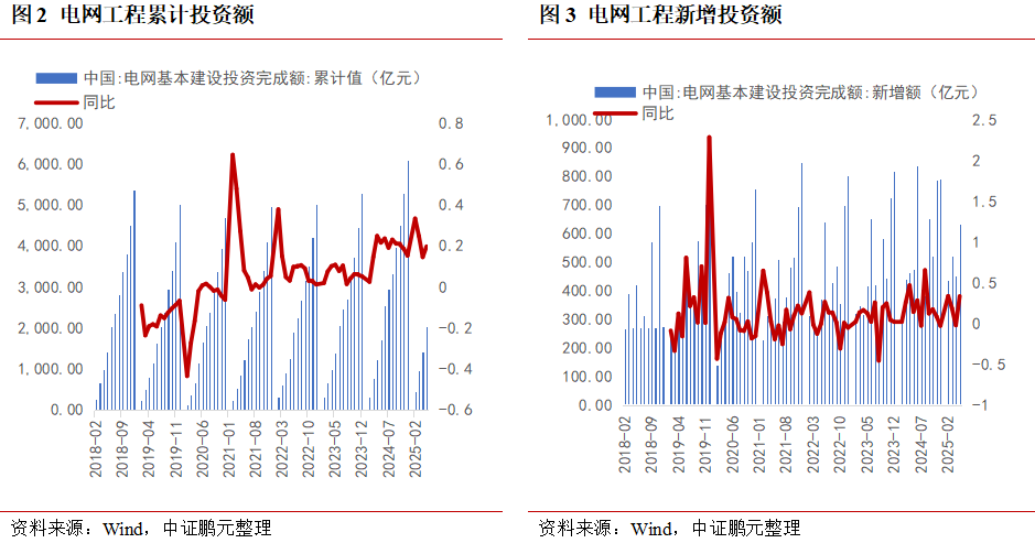 2025年电网建设景气度延续。2025年Q1国家电网投资达978亿元,同比增长27.7%,创一季度历史新高。其中,1-2月电网投资额达436亿元,同比增长33.33%,保持高增速。一季度在建特高压工程全面复工并进入满负荷、高强度施工状态,累计完成特高压投资额达172亿元。国家电网于2025年初公布全年投资规模有望首次超6500亿元,中期调整仍有上行空间,南方电网固定资产投资预计1750亿元,均创历史新高,2025年全年景气度确定。