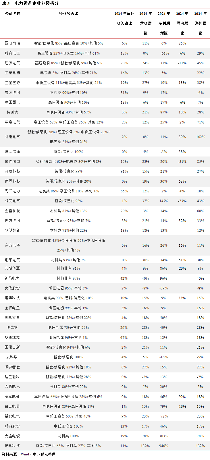 2024年国内电网设备市场预计总规模约为18000亿元人民币,同比增长13%,这一增长主要得益于网内、网外以及出海三轮驱动。(1)网内需求作为行业的基本盘,表现稳健。2024年国家电网投资首次突破6000亿元,同比增长 13%,重点投向特高压交直流工程、县域电网互联互通及数字化智能化升级。与此同时,南方电网2024年固定资产投资达1730亿元,同比增长24%。(2)网外需求则是行业增长的增量主力。网外主要包括发电侧和用电侧。在发电侧,2024年市场规模约为1800亿元,同比增长22%。这一增长主要得益于风电新增装机79GW,同比增长5%;地面光伏新增装机159GW,同比增长33%;储能新增装机42GW,同比增长97%;水电新增装机14GW,同比增长79%;以及核电新增装机4GW,同比增长184%。尽管火电新增装机54GW,同比下降7%,但新能源项目的逐级汇流升压需求,使得1GW的设备价值量高于传统火电和水电。用电侧2024年市场规模将超过3000亿元,同比增长约5%~10%,这一增长主要依据全社会用电量同比增长6.8% 以及制造业固定资产投资同比增长9.2%推测,算力发展使得AIDC成为趋势。(3)海外需求是行业增长的重要动能。2024年国内电力设备出海规模6000亿元,同比增长11%,其中变压器、高压开关、智能电表等重点品类直接出口额分别增长27%、24%、10%。新兴市场与欧美市场占比约为65%比35%,新兴市场成为出海主要增长点。