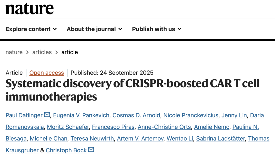 这项研究来自奥地利科学院分子医学研究中心聚美策略,论文题为:Systematic discovery of CRISPR-boosted CAR T cell immunotherapies(系统性发现经 CRISPR 增强的 CAR-T 细胞免疫疗法)。