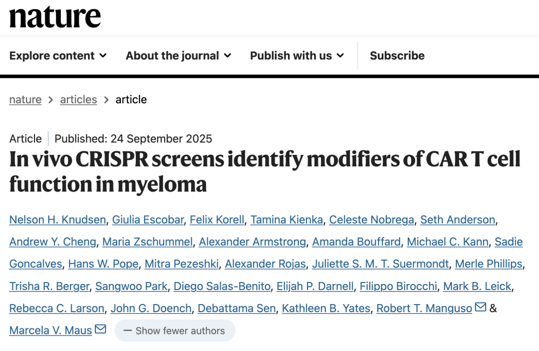 这项研究来自哈佛医学院麻省总医院,论文题为:In vivo CRISPR screens identify modifiers of CAR T cell function in myeloma(体内 CRISPR 筛选鉴定出多发性骨髓瘤中 CAR-T 细胞功能的调控因子)。